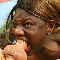 Sharee came in saying how she's into this type of stuff, and how's she's a good deep throater and basically giving me lip service. It turns out that this snooty little cunt was telling the truth. She is the real deal. This choco-dyke took Pauly's huge white man meat all the way down her throat without breaking a sweat. She didn't even flinch when he gave her crisp slaps across her face. On top of that, this girl takes hard cock up her ass like a boss (and she'll clean it off with her mouth). I guess all that money she spent on college was a waste because the only thing she's been burying her nose into is cock and balls!